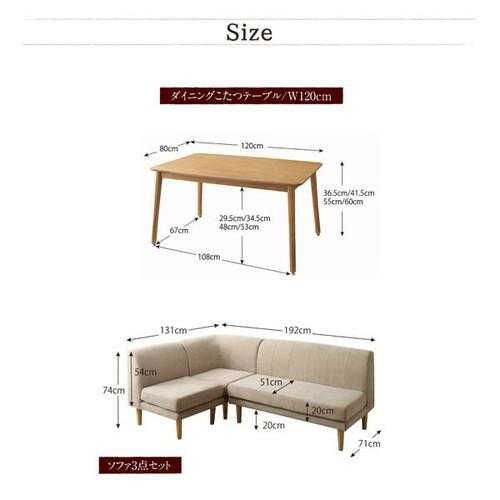 年中快適 こたつもソファも高さ調節 リビングダイニングセット■こたつテーブル(W105cm)【サイズ】(約)幅105 奥行75 高さ36.5/41.5/55/60cm【梱包サイズ/重量】(約)120 84 12cm/20kg■こたつテーブル(W120cm)【サイズ】(約)幅120 奥行80 奥行36.5/41.5/55/60cm【梱包サイズ/重量】(約)135 88 12cm/22kg■こたつテーブル共通【材質】天然木オーク突板、MDF、ラバーウッド、【塗装】天板:ウレタン塗装/その他:ラッカー塗装【ヒーター】500W石英管ヒーター、中間スイッチ付【電源コード長さ】(約)3m【生産国】ベトナム※ヒーター部メーカー1年保証付き。