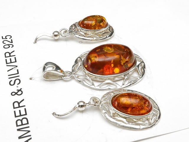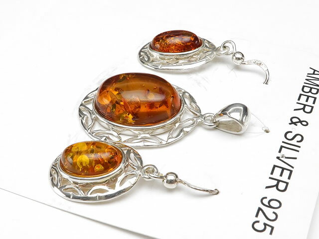 繊細なシルバー細工にアンバーを使用したペンダントトップとピアスのセットです。